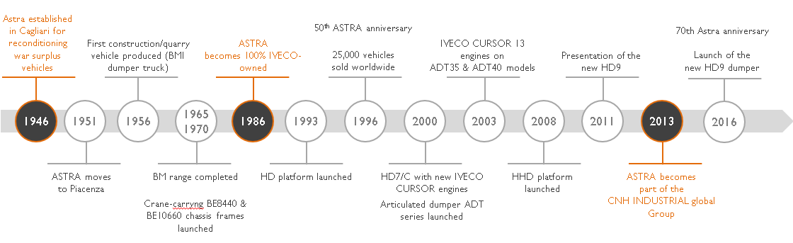 En 1951 se trasladó de Cagliari a Piacenza, donde se desarrolló el primer vehículo ASTRA de cantera y obra: el dúmper BMI (1956).